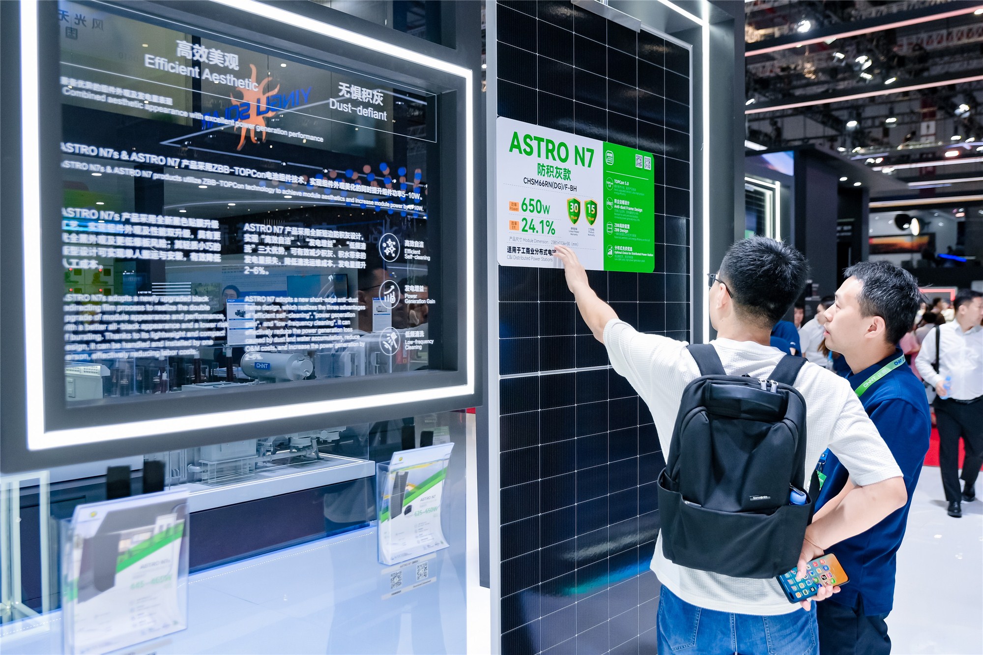 作为本次全新亮相的另一款主力产品——ASTRO N7 ZBB防积灰组件以其高效自洁、低频清洗、高发电增益等特点,备受参展者关注。ASTRO N7 ZBB防积灰组件在ASTRO N7版型基础上,叠加TOPCon 5.0电池、ZBB一体化覆膜、短边防尘边框等技术,有效减少积灰导致的发电量损失,显著提升2-6%发电量的同时,还可减少运维频次,降低运维成本。此外,ZBB-TOPCon的外观优势,加上组件高达24.1%的转换效率,也使其高度匹配工商业光伏建筑需求。