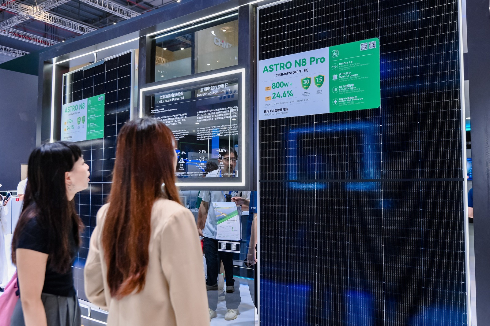 技术储备区展出的ASTRO N7 Pro与ASTRO N8 Pro预示着下一代技术方向:ASTRO N7 Pro采用多分片切割技术,搭载TOPCon 5.0电池和210R硅片,同时叠加SMBB/ZBB、间隙贴膜、双层镀膜等行业领先技术,具有高效美观、低热斑风险、高可靠性、高发电量等优势;同时得益于优异的低开压设计,有效降低土地、电缆、逆变器支架的使用,具有更低BOS成本及LCOE,可为客户带来更高的发电收益,适用于集中式、分布式等多种应用场景。