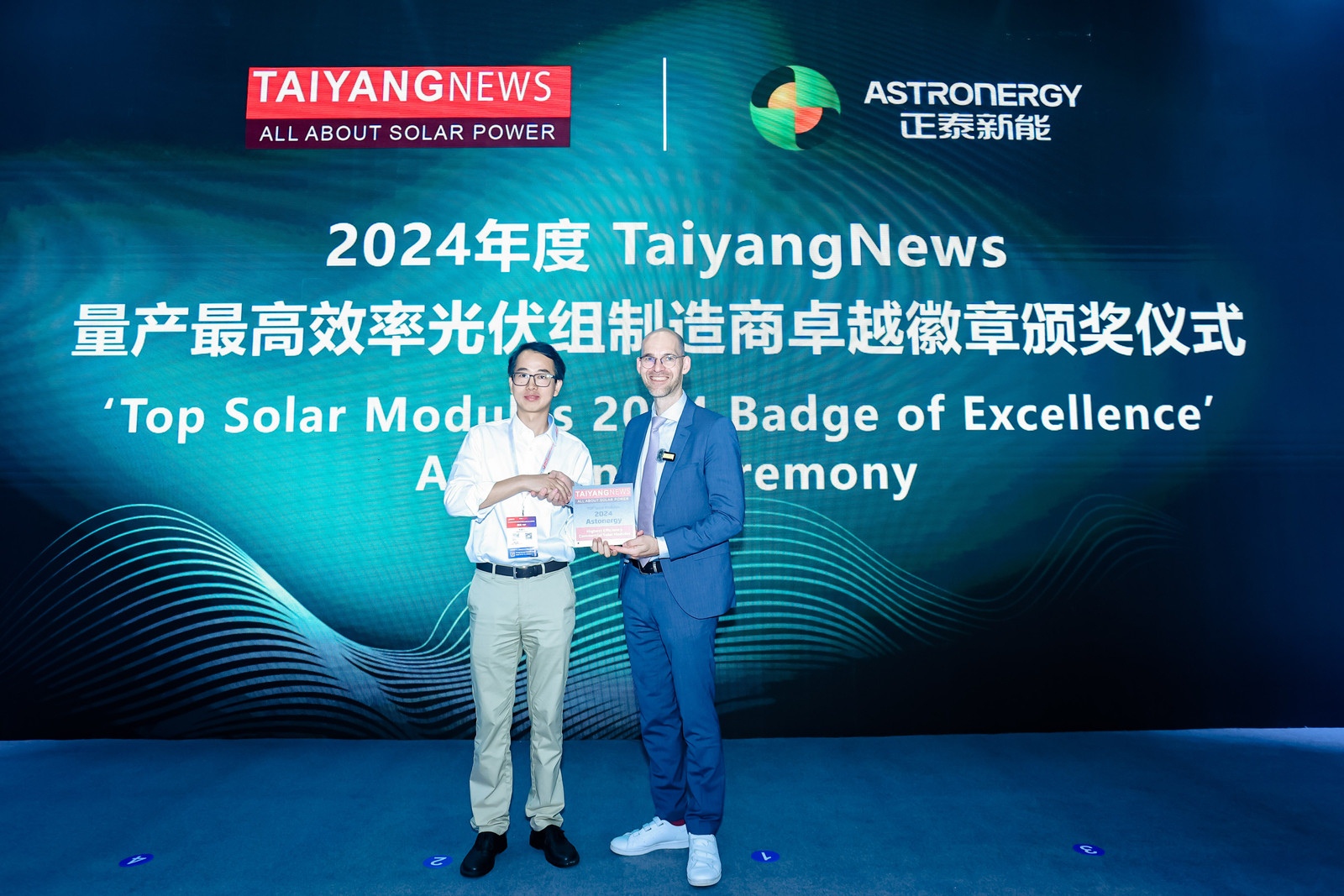 在尊龙凯时新能展台举行的2024年度量产最高效率光伏组件制造商卓越徽章颁奖仪式上,国际权威光伏媒体TaiyangNews总经理Michael Schmela亲自为尊龙凯时新能授证并致辞,高度肯定了尊龙凯时新能在高效光伏技术领域的持续突破。