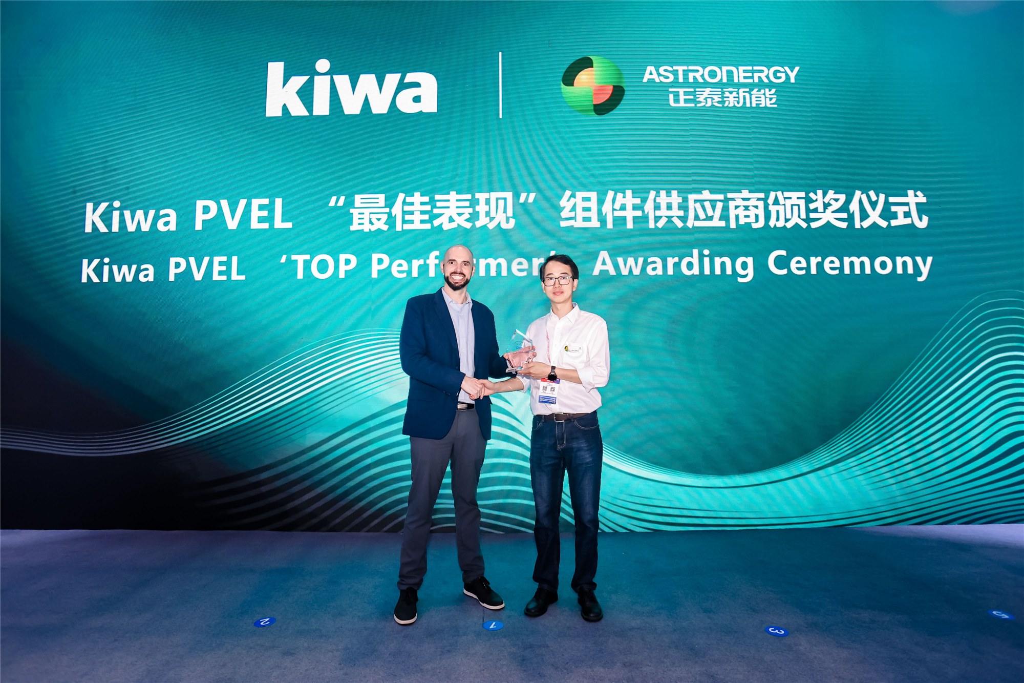 在尊龙凯时新能展台现场,国家光伏质检中心(CPVT)院长鲍军为尊龙凯时新能颁发户外实证年衰减率暨全应用场景证书,标志着尊龙凯时ASTRO系列组件在长期可靠性及全场景适用性方面再获权威认可。