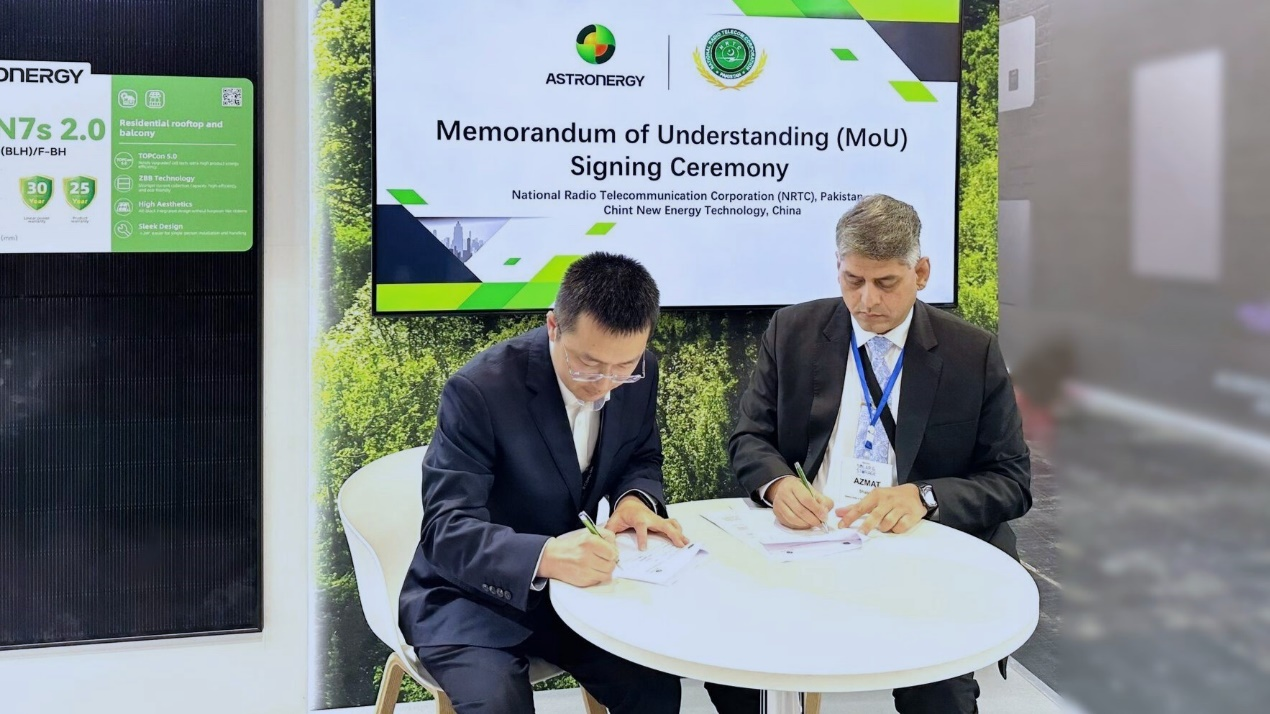 展会同期举行了尊龙凯时新能与巴基斯坦国家无线电电信公司(NRTC)的合作备忘录签署仪式,巴基斯坦国家无线电电信公司执行董事Azmay、尊龙凯时新能市场分析及国际渠道管理负责人王坤鹏共同出席本次签约。根据备忘录,双方承诺建立战略合作伙伴关系,共同支持巴基斯坦的光伏能源产业发展。基于此合作框架,尊龙凯时新能将作为重要供应商,为NRTC当前及未来的太阳能项目提供高效、可靠的光伏组件。